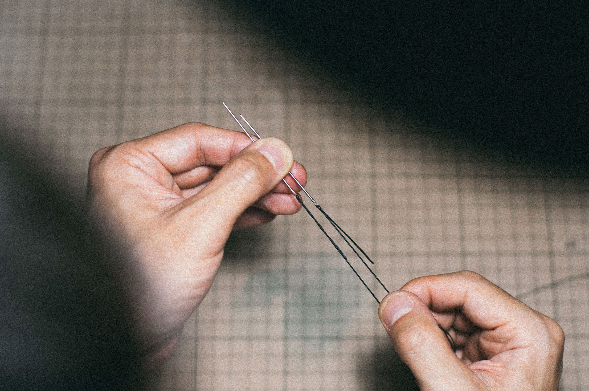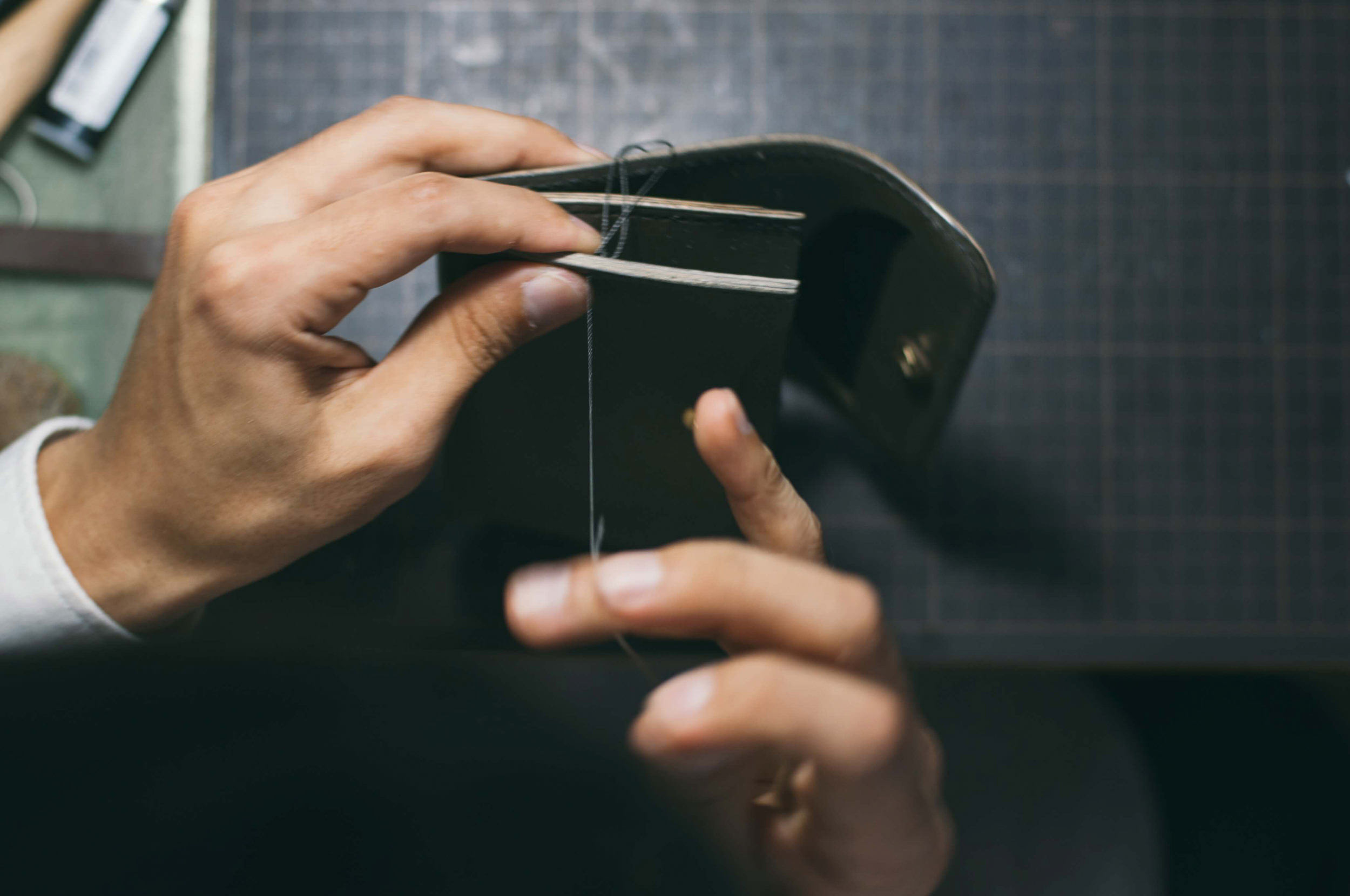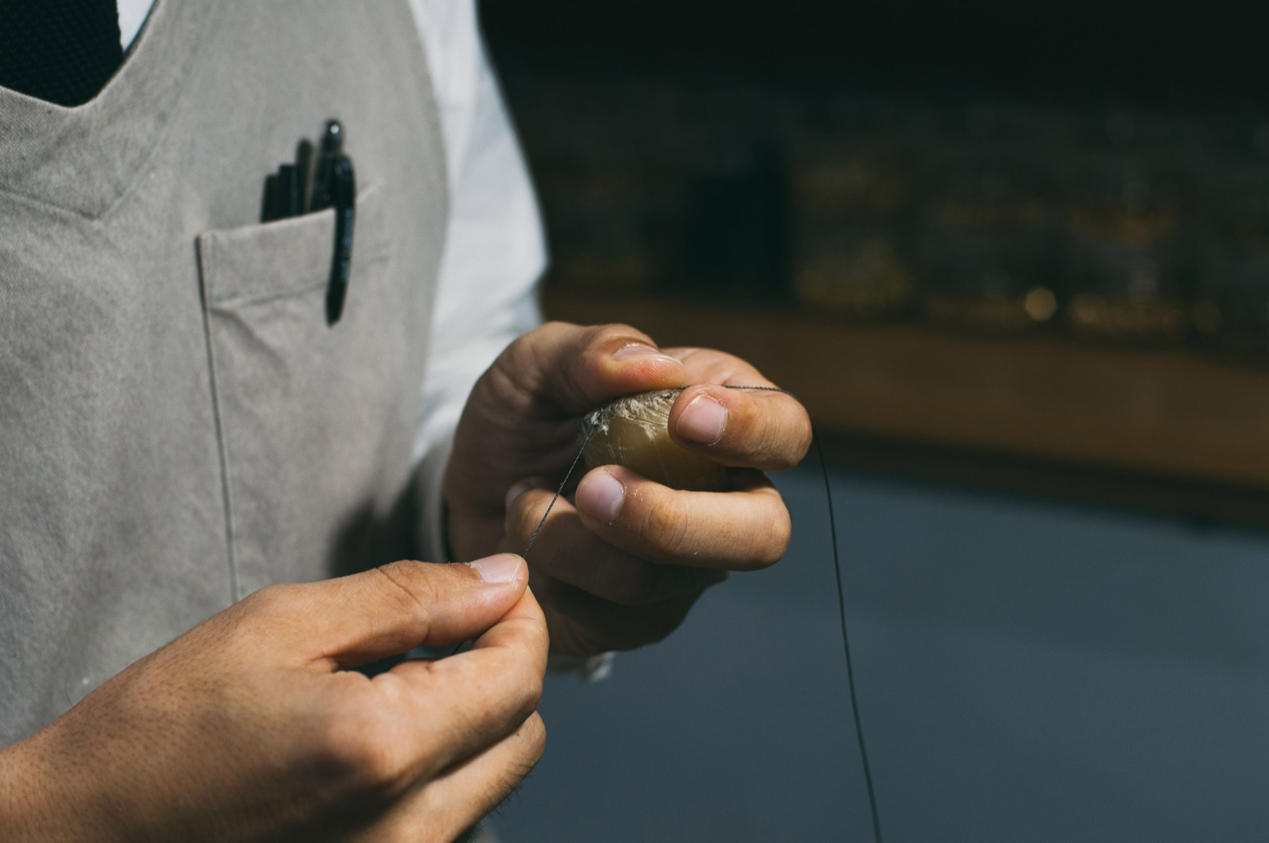 そのままでは硬くて針の通らない革は、目打ちを使って穴を開けてから縫います。蜜蝋を引いた麻の糸の両端に針を付け、両側から交互に針を通す「サドルステッチ」という製法で縫っていくのですが、この製法で縫い上げると革に糸がしっかりと食い込んで、ちょうど両側から波縫いをしたようなカタチになり、とても丈夫な縫い目になります。ミシン縫いの場合には上糸が下糸をすくって縫う仕組みなので、糸が貫通していないためどこか一部がほつれると全てほどけてしまうという欠点がありますが、サドルステッチにはこの欠点がありません。