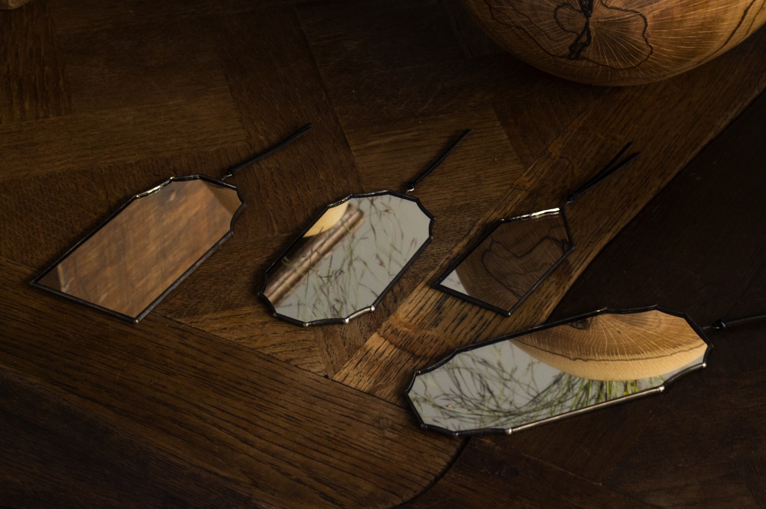 木の器やオブジェなどを制作する「盛永省治」と一緒に、〈鏡×木×革〉の融合作品も製作しました。