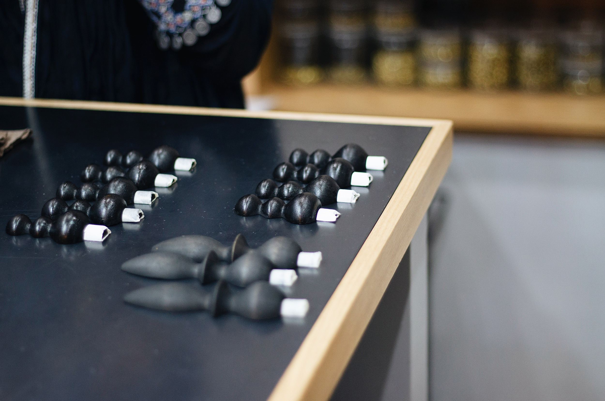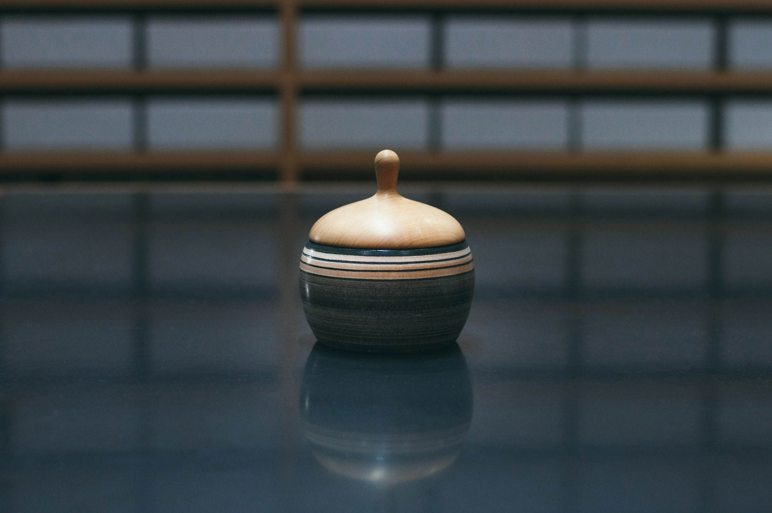 容れ物に合わせてぴったりとおさまるようにつくられた蓋は木で出来ており、縞模様が美しい器は厚みのある仕上がりで革特有のどっしりとした重量感を感じさせます。本体は、革を何十枚も重ねて圧着した塊を削りだして成形しており、セカンドラインのLEFTOVERで製作しているブローチと同じく「積み革」と呼ばれる技法を用いてつくられています。