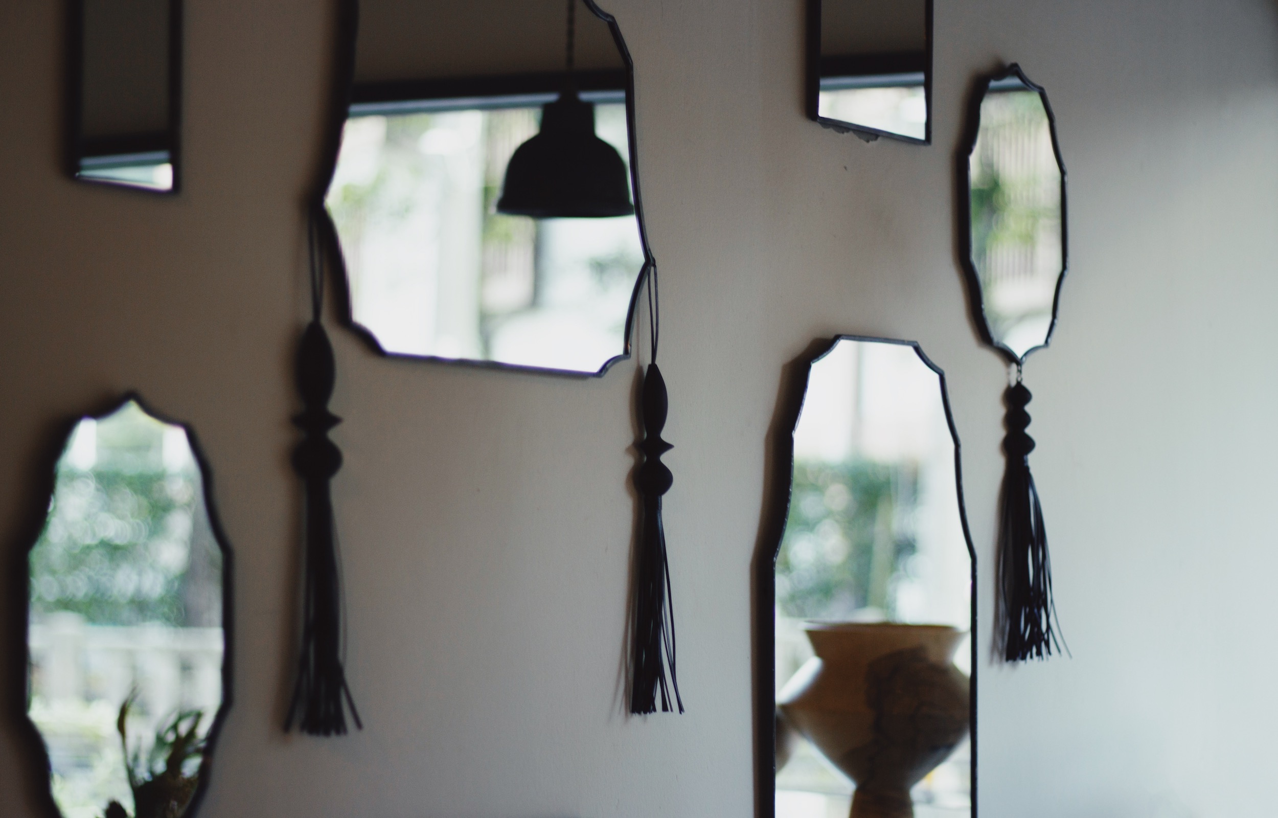 鉛素材を用いた枠をベースに、革と木のタッセルを黒色で統一した鏡はアッシュのための特別な作品です。シングルミラーはタッセルの取外しが出来るように設計したため、場所を限定せずコンパクトにお使いいただくことも可能です。イベント期間限定で販売する作品となります。