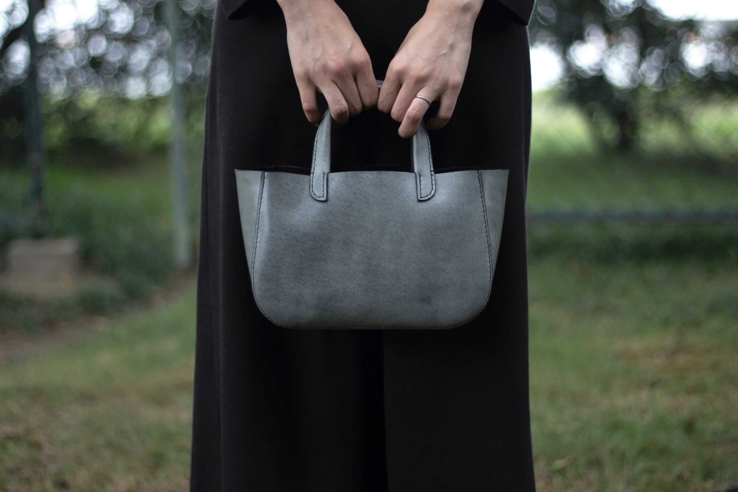 今回のシーズンカラー「mist/ミスト」は、グレーのように見えますが、実は黒い革の表面にホワイトワックスを噴霧したもの。使い込むと共にワックスが少しづつ薄くなり、下地の黒がツヤを増しながら表れます。