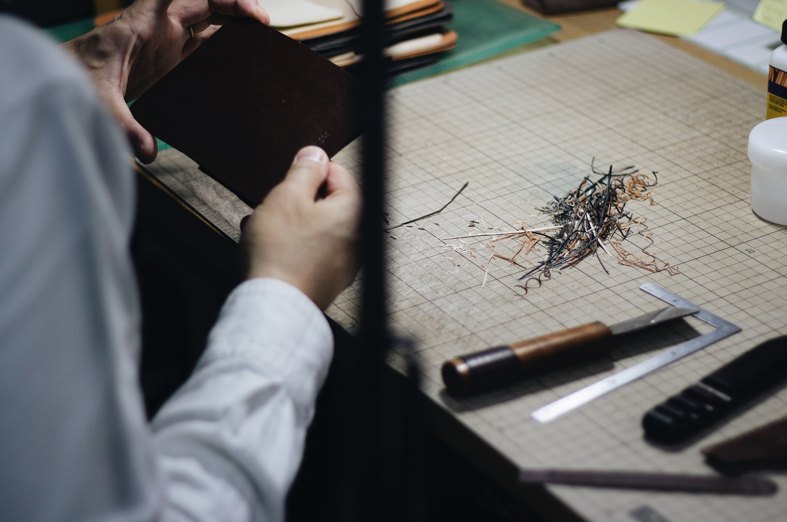 革を貼り合わせたり、断ち落としたり。ひとつのパーツの細部も丁寧に仕上げます。