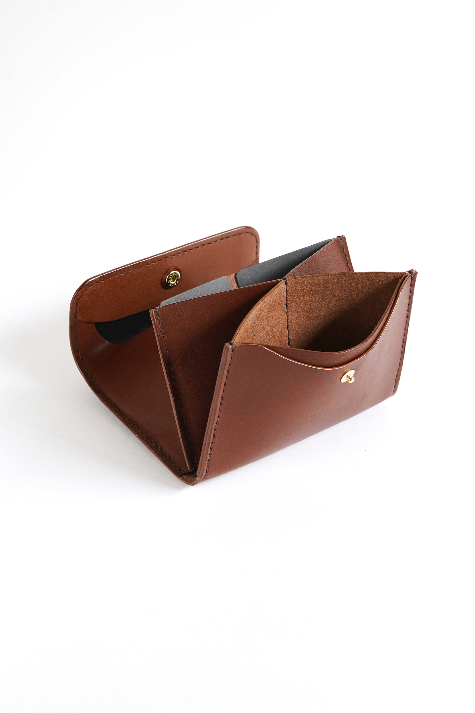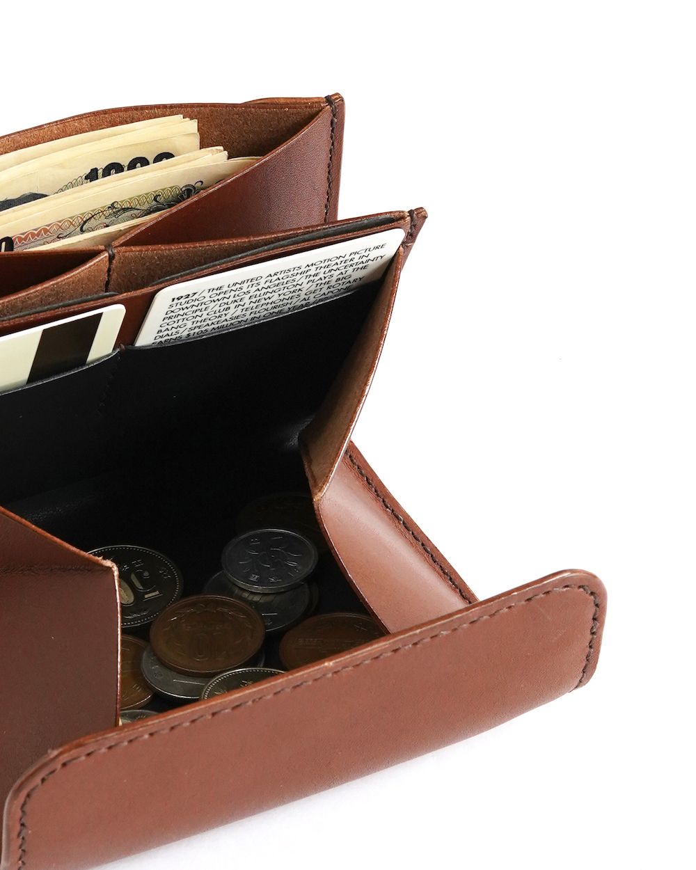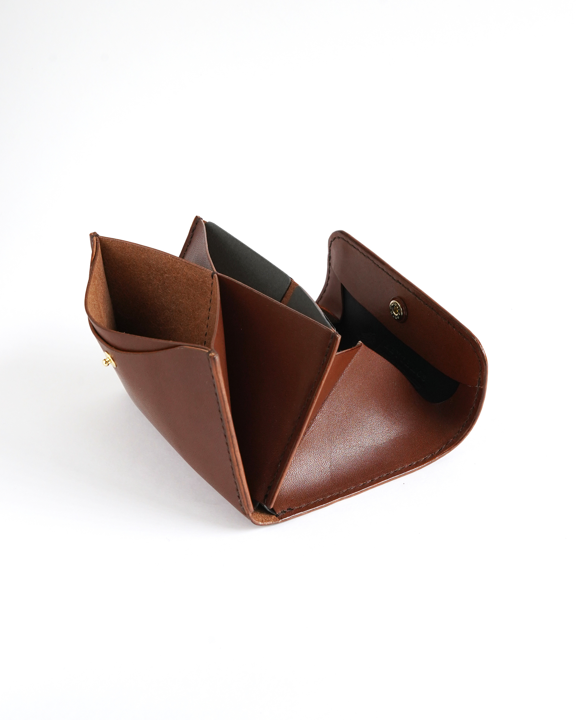 吊り込みという技法を用い、蓋を自然と内側にカールさせることで小銭が滑り落ちないように工夫されており、コインポケットの内部に黒いインナーを採用することで大きく開げた際にも上品な印象です。