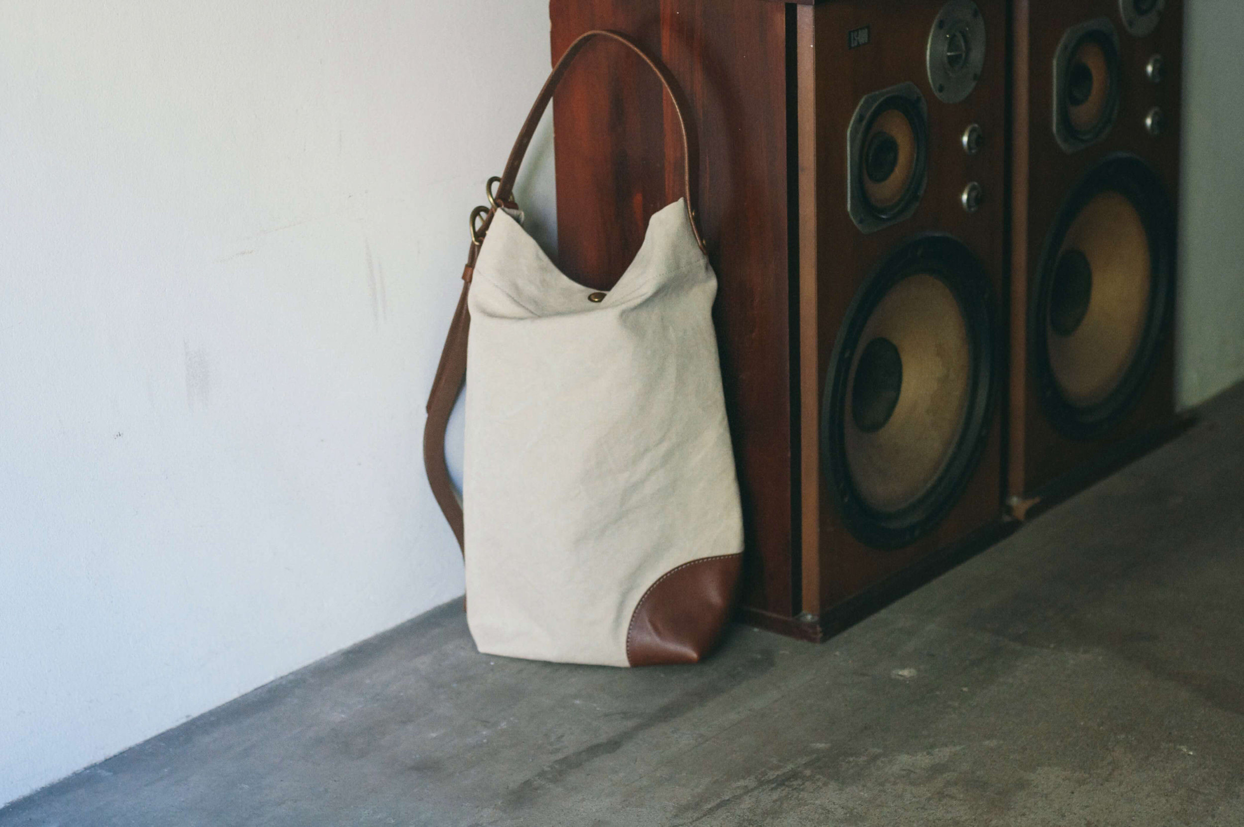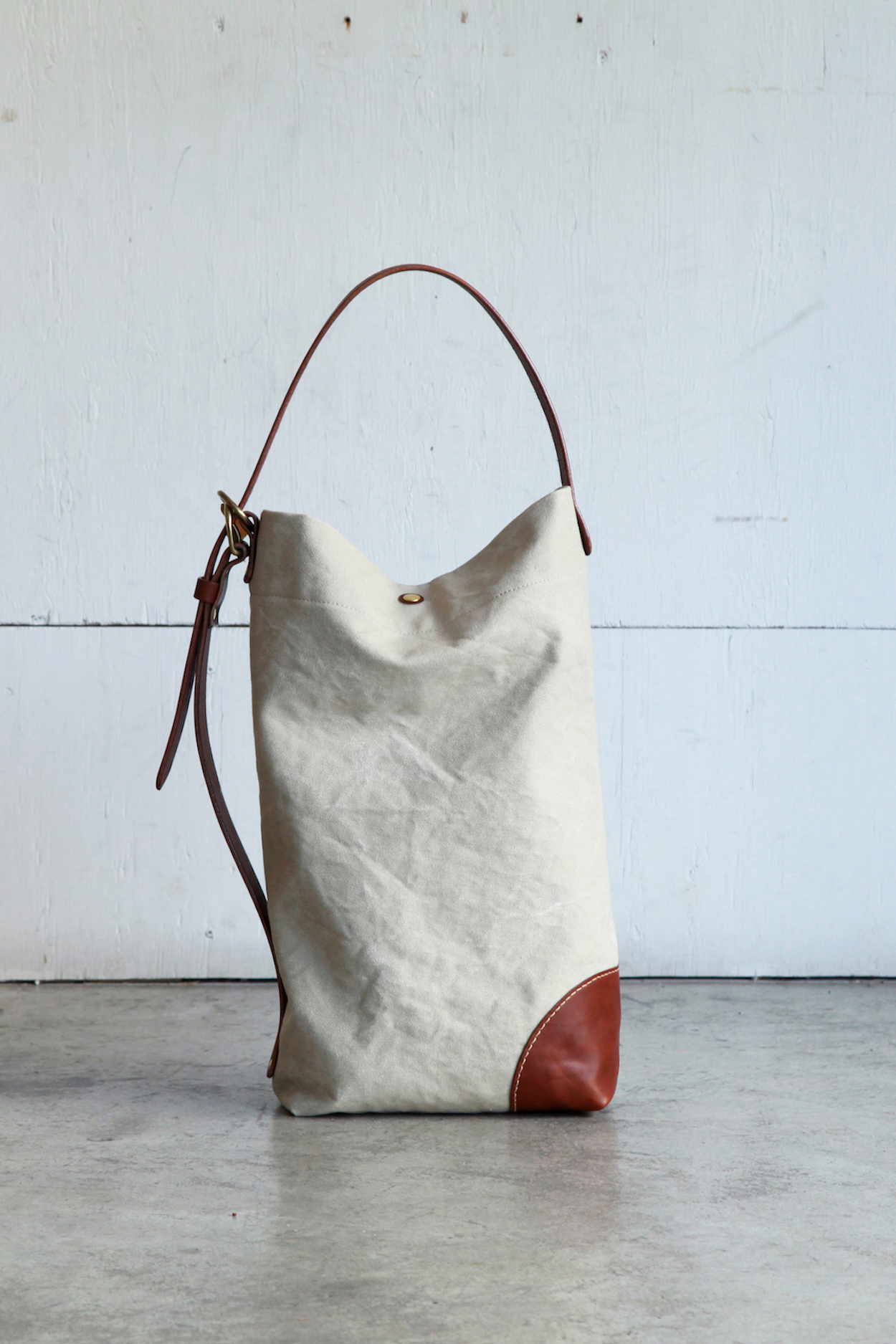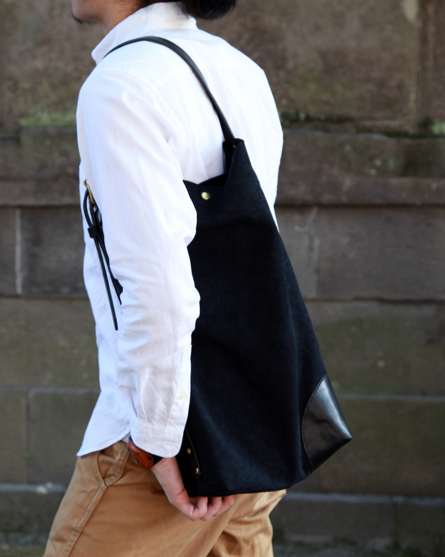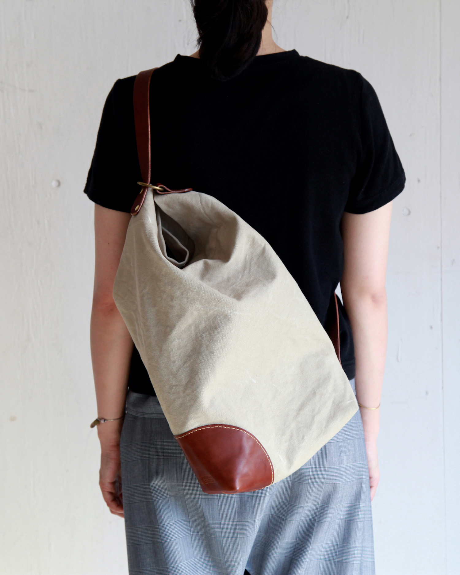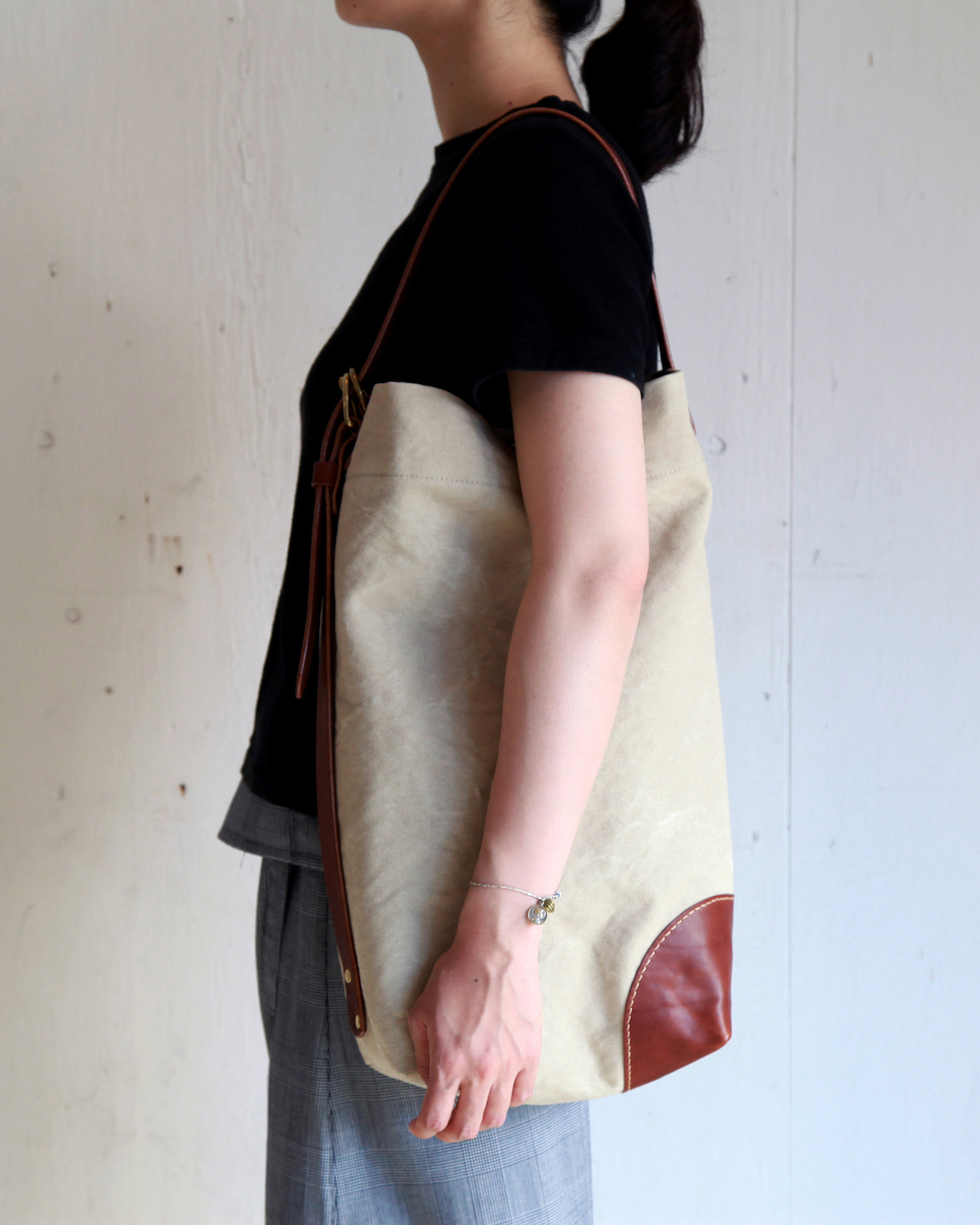 縦型のバッグに使われているコットンキャンバスは、6号帆布というとても厚手で丈夫な素材ですが、使い始めから持ちやすいように、帆布生地の繊維を柔らかくするための作業を重ねくったりと柔らかい手触りに仕上げてあります。