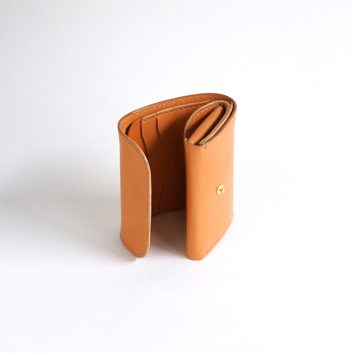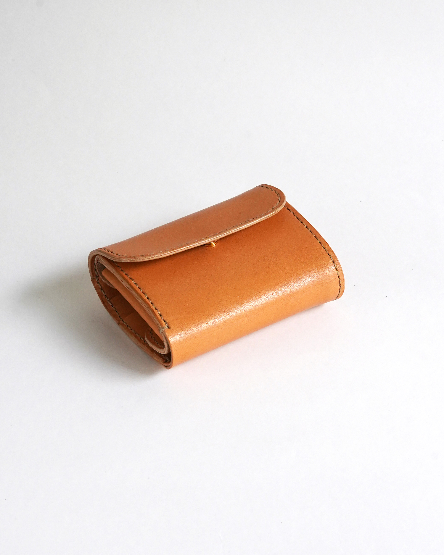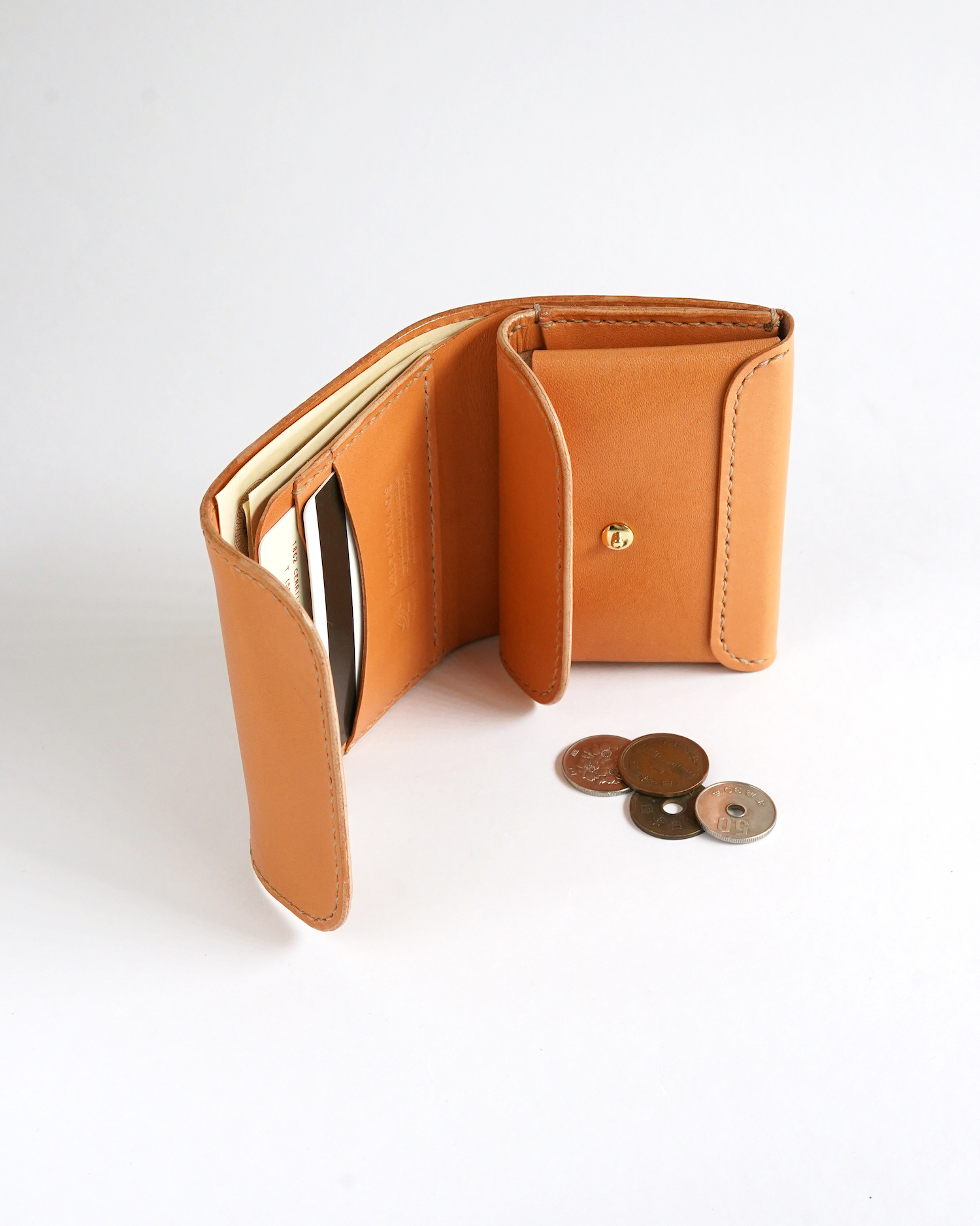必要最低限の小銭、お札、カードが収納でき、お札は伸ばした状態で出し入れが出来る三つ折り構造です。
