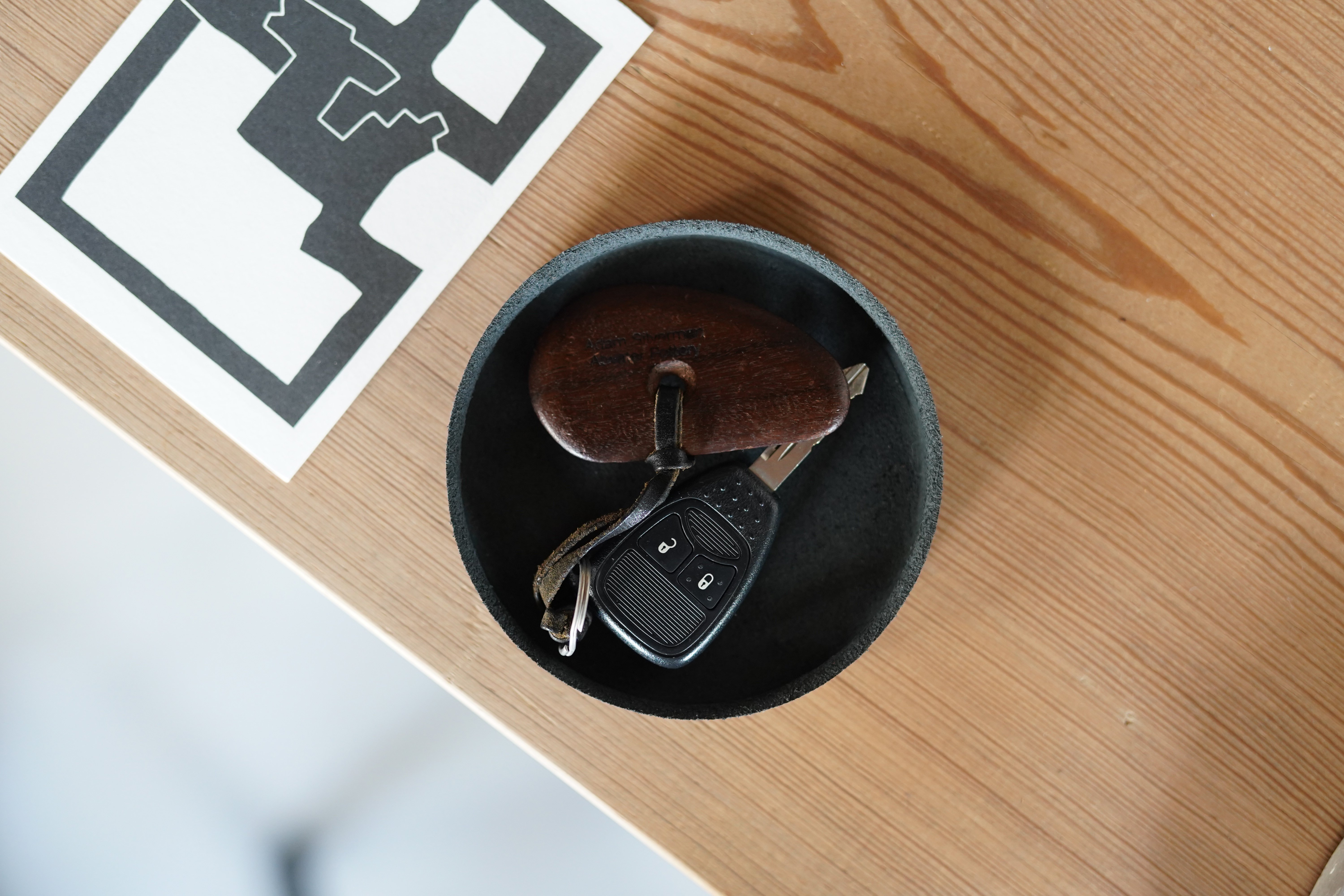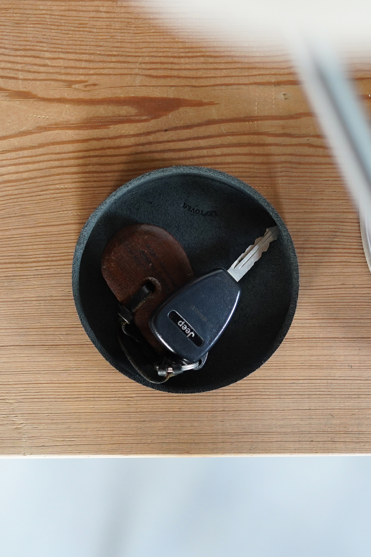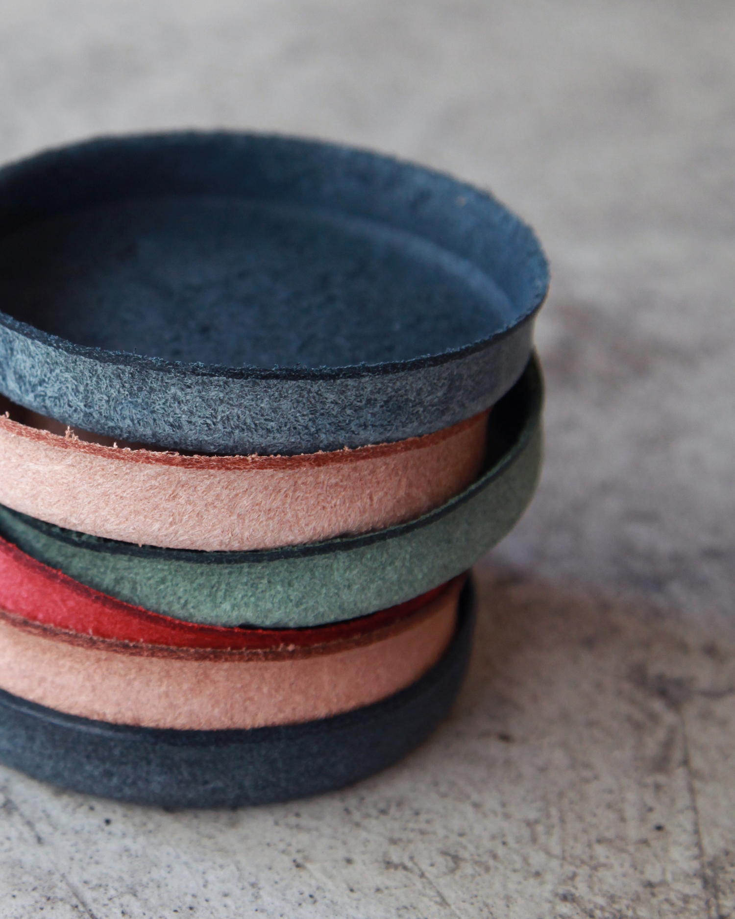 丸型のトレーは、一枚の平面的な革を、専用の木型を用いじっくりと時間をかけてプレスすることで、立体的な成型を可能としました。散らかりがちな小物の置き場として、小銭や鍵などの整理に便利です。