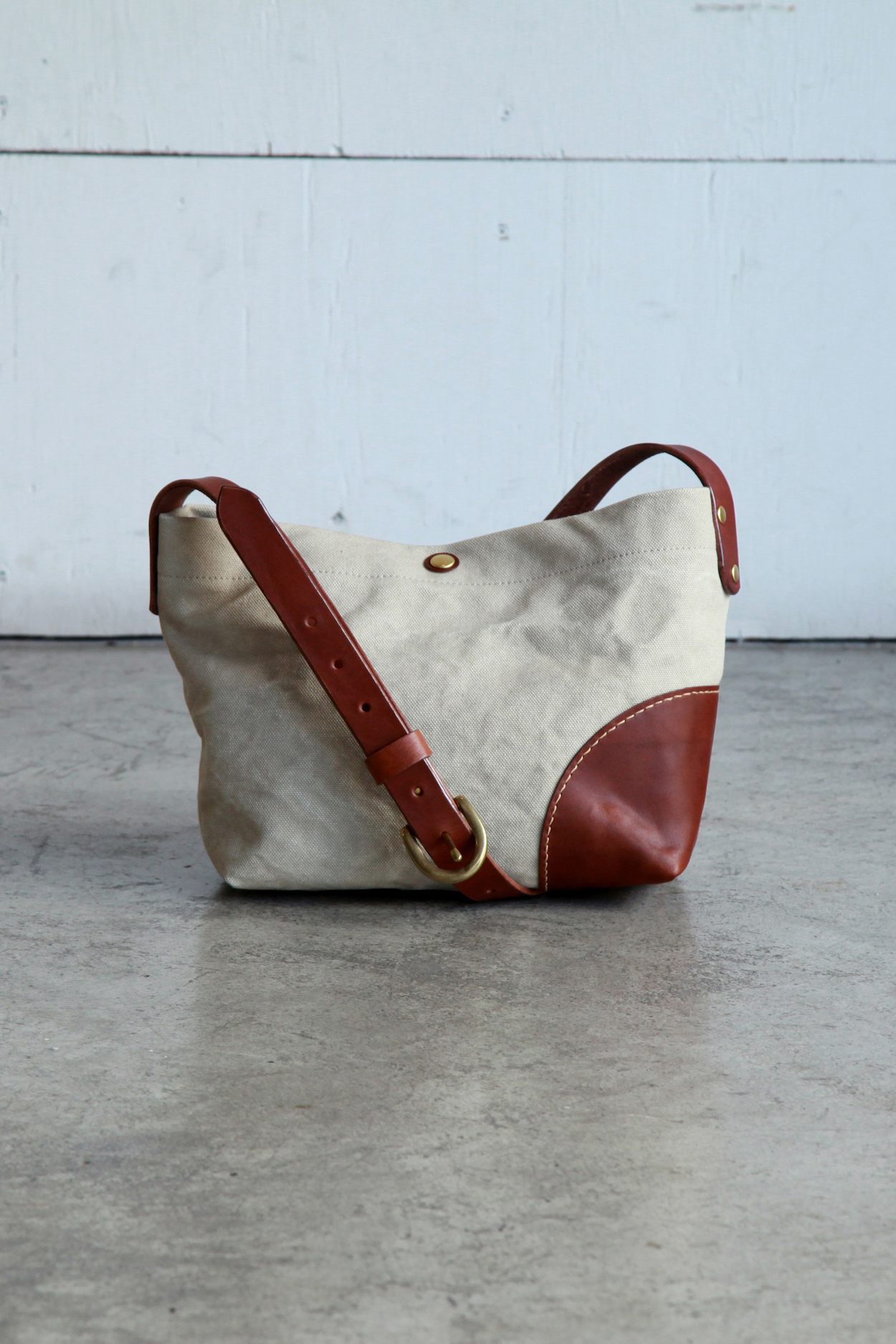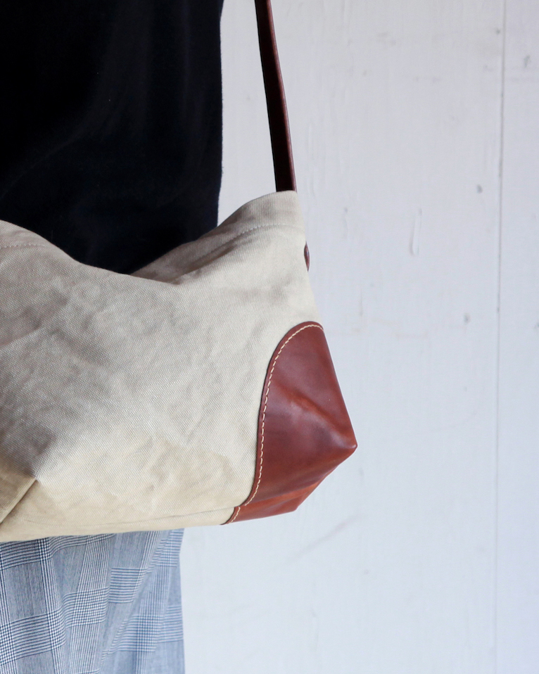 本体に使われているコットンキャンバスは、6号帆布というとても厚手で丈夫な素材ですが、使い始めから持ちやすいように、帆布生地の繊維を柔らかくするための作業を重ね、くったりと柔らかい手触りに仕上げてあります。